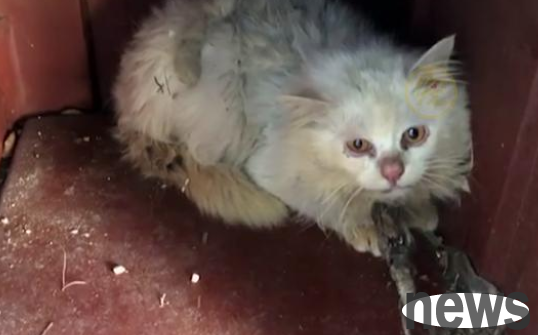 The cat's originally white and soft fur is covered with dirt and has long been knotted into a clump. A thick rusty iron chain was tied to its neck, and the other end of the iron chain was fixed to a large stone.