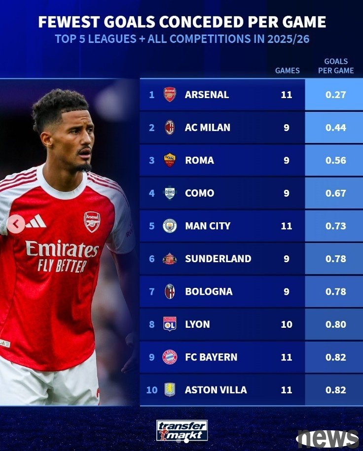 List of the five major league teams with the fewest goals conceded per game this season: Arsenal leads the list, followed by Milan and Roma