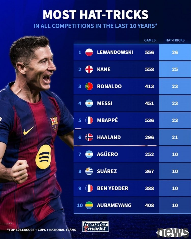 Ranking of caps in the top ten leagues in the past 10 years: Lewandowski leads the list with 26 times, Kane 25 times and Melo 23 times