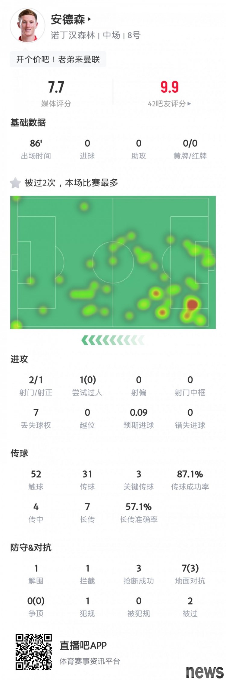 Shine at Anfield! Anderson data: 3 key passes, long pass success rate 57.1%