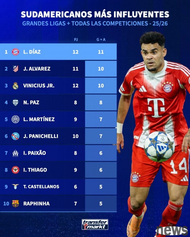 The German Transfer Market has counted the number of goals scored by South American players in the five major leagues this season and listed the list. Luis Dias ranks first with 11 goals, followed by Alvarez and Vinicius with 10 goals.