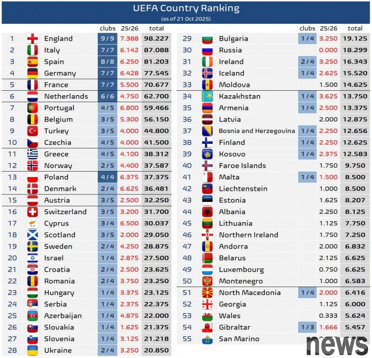 Spain - 6.250 in the 25-26 season - total points 81.203