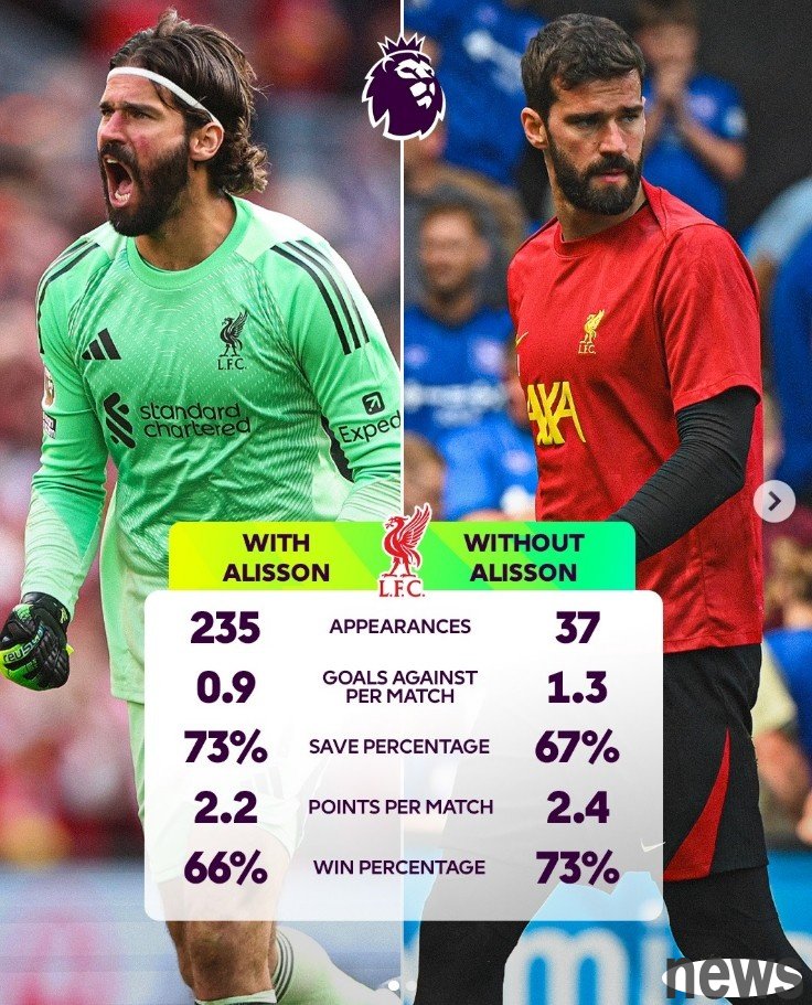 The Premier League official inventory of Liverpool data when Allison was absent, with averaging 0.4 goals per game