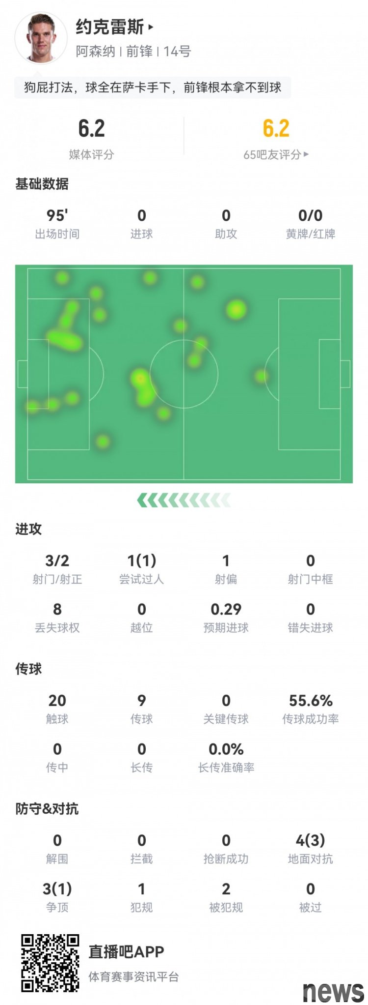 In this round of the Premier League, Arsenal defeated Fulham 1-0. In this campaign, Jocles was substituted in the first 95 minutes. The key statistics of the players are as follows↓